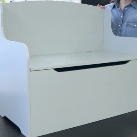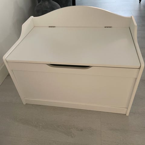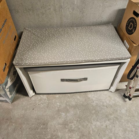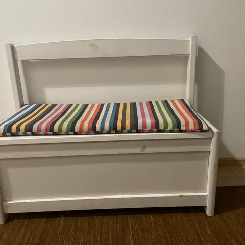 70×35×25 kiste/bænk med opbevaringsplads til legetøj. Lyserød med Hello Kitty. Synlige brugsspor, men stadig funktionel og fin.