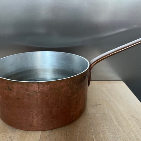 Kobbergryde med håndtag på hele 5 liter. Denne vintage kobbergryde er farmors gamle fransk køkkengrej, i en skøn landstil fra hendes landkøkken. Stor og flot rustik charme til dit køkken, perfekt til både madlavning, saucer, supper, grydesteg eller bare som dekoration i et landkøkken eller rustikt hjem. Denne kobberpotte, gryde med kobberbelægning eller dekorativ kobbergryde er både funktionel og flot – og den leder varme rigtig godt, som kobber jo er kendt for. Den har en inderside i metal så du kan bruge den til madlavning, men den pynter mindst lige så meget, hvis du bruger den som blomsterkrukke, urtepotte, isspand eller køkkenpynt. Måler 12 cm i højden, 25 cm i diameter og 48 cm i total længde med håndtaget. Der er selvfølgelig en hel del patina og brugsridser da den er blevet brugt, som kun giver den ekstra charme – og understreger det autentiske look. Håndtaget sidder godt fast og fungerer perfekt. Dette gamle klassiske 5L vintage køkkengrej / kogegrej kan blive din for 200 kr.