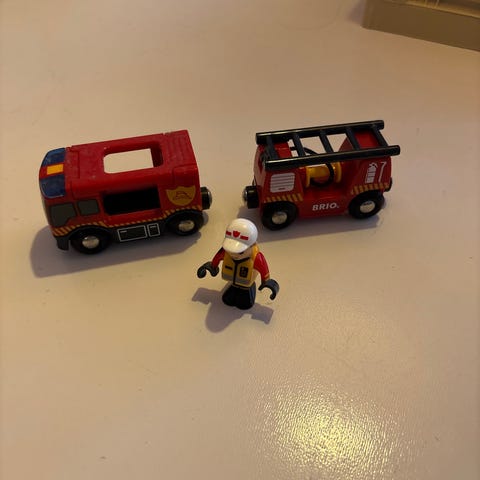 BRIO Brandbil legetøj i rød og hvid med fire hjul. Fremstillet i plastmateriale. Designet til børn som legetøjsbil med brandmandsfunktion.