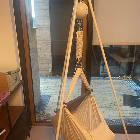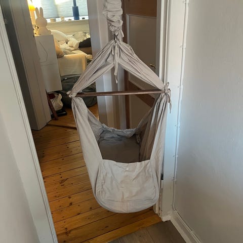 Vi sælger vores dejlige motoriserede slyngevugge fra Moonboon. Der medfølger en ekstra afstiver-madras, så vuggen kan bruges længere. Stativ fra Nonomo medfølger også.