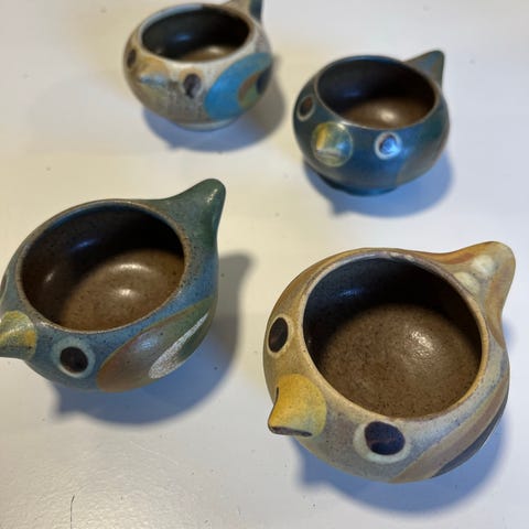 6 æggebægre (kr. 450 pr. stk. Heraf 2 med små skår kr. 100 pr. stk.)