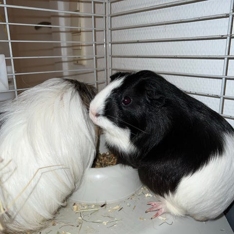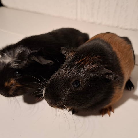 De snakker både når vi er i køkkenet, og når de sidder hos os, hvilket de meget gerne vil. De kender lyden af grøntsagsskuffen og fortæller højt at de er sultne, når grøntsagerne hakkes. De popkorner rundt i buret, hopper op på husene, slapper af, og når de skal tisse, går de ned i kassen med spåner, hvilket gør den daglige rengøring meget overskuelig. De er meget rolige og vi hører dem næsten kun når de er sultne. De har altid været vant til at spise piller af skål, ligesom de også drikker vand af skål, hvilket de gør helt lydløst.