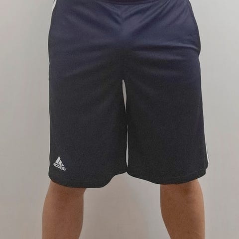 Adidas sportsshorts til mænd i størrelse L. Shortsene er mørkeblå og designet til sport. Materialet er polyester og de er egnet til forskellige sportsaktiviteter. Hurtigtørrende.