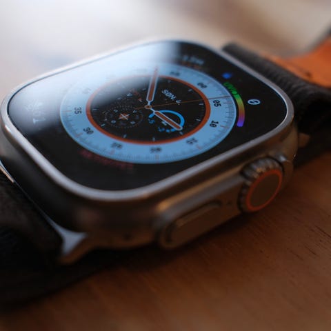 Apple Watch Ultra smartwatch med sort silikonerem. Uret har en robust titaniumskasse og inkluderer en magnetisk oplader til trådløs opladning. Designet til daglig brug med fokus på holdbarhed og funktionalitet.
