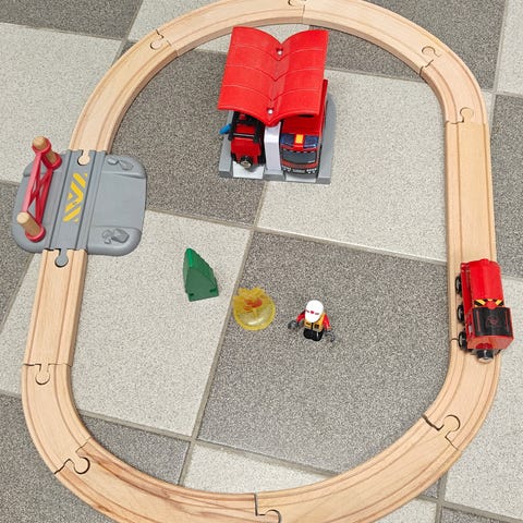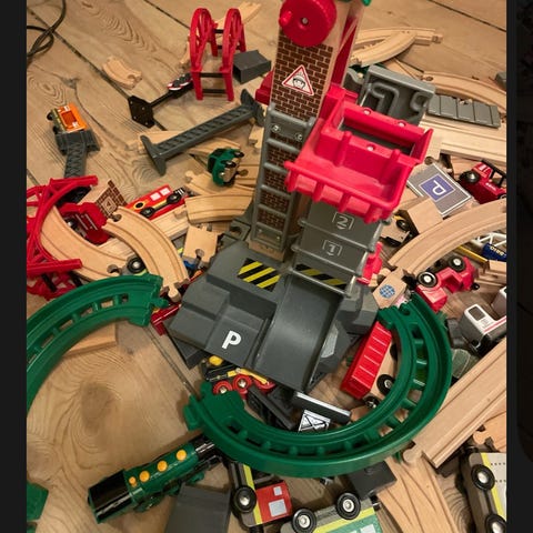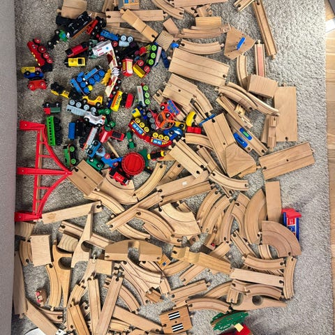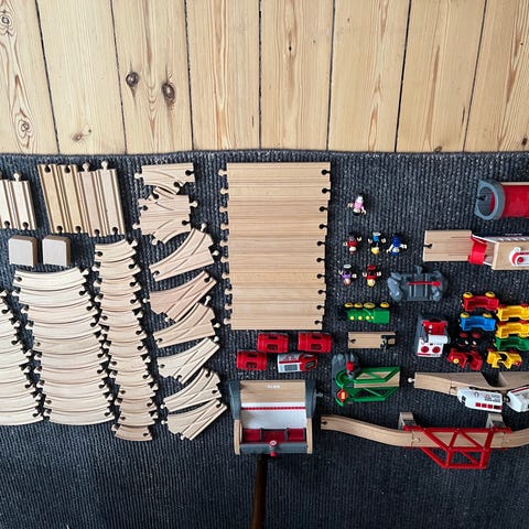 BRIO togbane blandet med andet mærke i træ Indeholder forskellige bøjede og lige skinner, broer, tog og tilbehør.