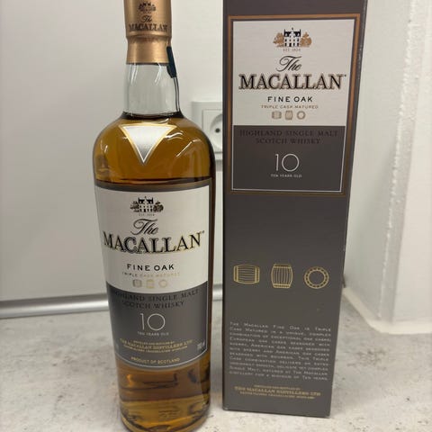 The Macallan Fine Oak 12 år Whisky i en flaske med 700 ml volumen. Denne whisky har lagret i 12 år og er kendt for sin fine eg-smag. Flasken er gennemsigtig med en label i blå og guld.