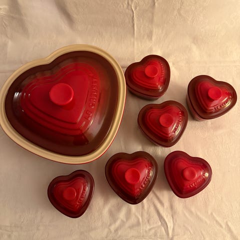 Le Creuset gryde i hjerteformet design med rød yderside og hvid inderside. Gryden er lavet af emaljeret støbejern, der sikrer god varmefordeling. Velegnet til tilberedning og servering af mad i mindre portioner.