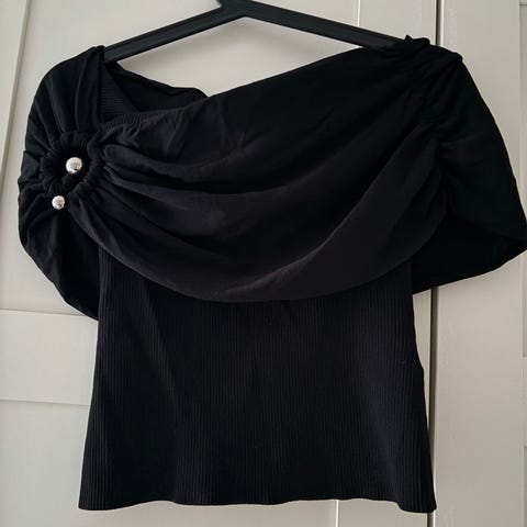 Zara top i størrelse M. Brugt enkelte gwnge, så standen er så god som ny. Materialet er 57% viskose og 43% polyamid. Flot åben ryg.