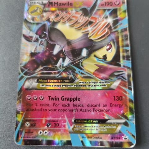Pokémon M Mawile EX samlekort med farverigt design og illustration af Mawile. Kortet indeholder angrebsoplysninger og energikrav. Kortets bagside viser standard Pokémon-logo med Pokéball. Kortet er velegnet til samling eller spil.