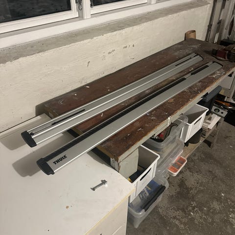 Thule tagbøjler til bil med sort finish. Designet til montering på bilens tag for transport af ekstra last. Fremstillet af holdbare materialer for stabilitet og sikkerhed under kørsel.