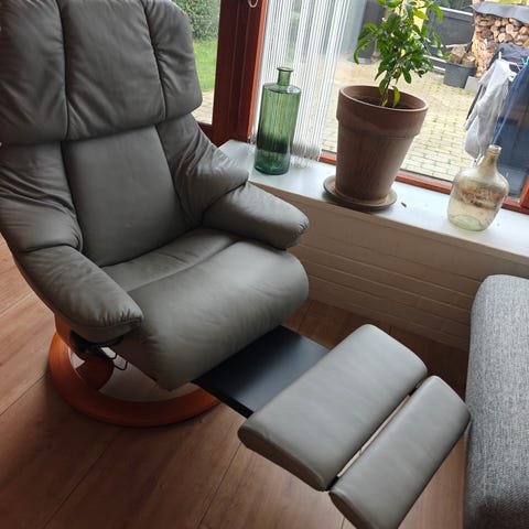 Elektrisk lænestol model Stressless Opal, næsten uanvendt. Indbygget elektrisk fodskammel, som styres uafhængigt af ryglænet. Læderbetrukket.
