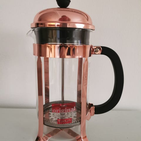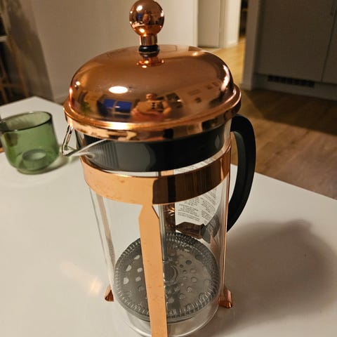 Den smukke Bodum i midten skal videre - vi er gået over til kaffemaskine og får den ikke brugt mere. Den har nogle brugsspor, men ikke noget man tænker over i daglig brug.