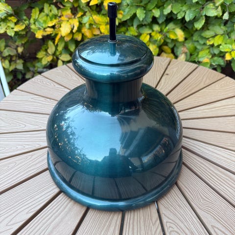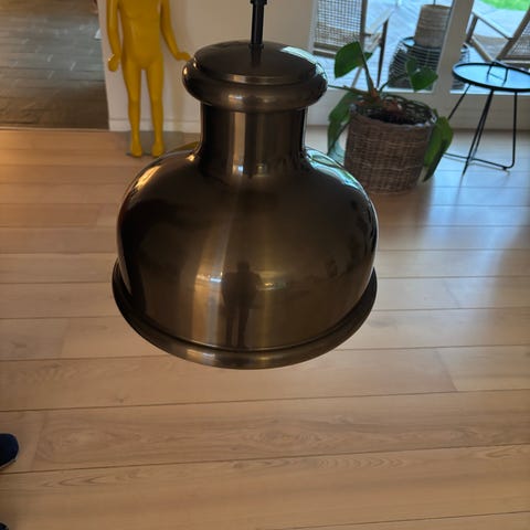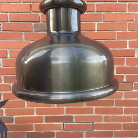 Klassisk pendel i malet metal med mørk bronze/gunmetal-finish. Giver et behageligt nedadrettet lys. Har en skramme i lakken (se foto), men ingen buler.
