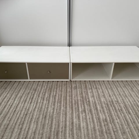 Tre Montana-moduler i hvid. Alle er 24 cm høje og 38 cm dybe, så de kan hænge ved siden af hinanden.