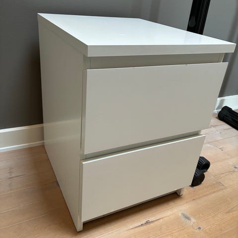 2 IKEA sengeborde i egetræsfiner med hvid bejdse. Kommoden har to skuffer og en overflade i lyst trælook. Velegnet til opbevaring i soveværelse eller stue.