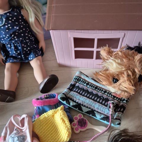 Lille hundehus med tilhørende hund den er lavet i plast og måler 16 ×10 ×11 cm Pris 25 kroner