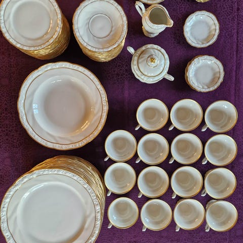 Flot Edelweis kaffe og spisestel indeholdende rigtig mange dele: Kaffekopper, underkopper, kagetallerkener, kaffekande, flødekander, sukkerskåle, kagefade, flade og dybe tallerkener, sovseskåle, æggebægerer, kartoffelskåle, fade m.m.