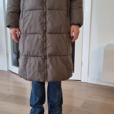 Fin varm vinterjakke med hætte. Sider med lynlås, så man kan cykle i den selvom den er lang. Ny pris 999,-