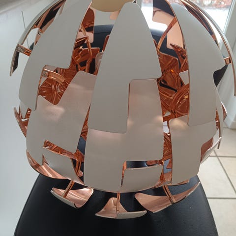 Den er i hvid og kobber indeni. Den kan lukkes og åbnes med snorene - fed effekt