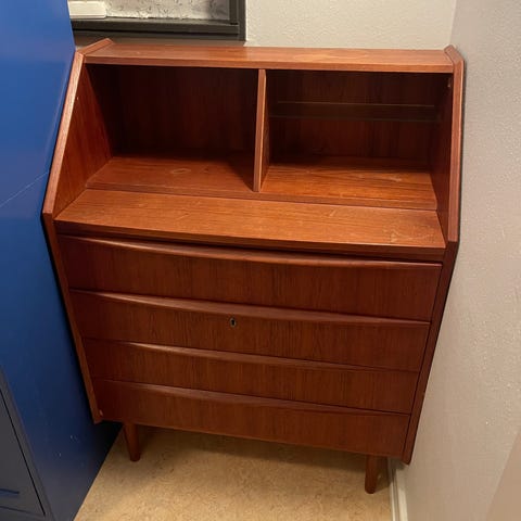 Flot kommode / skænk i teaktræ med to låger. Meget rummelig, så der er god plads til opbevaring. Den har let patina / brugsspor, se billederne, som nok ville kunne fjernes med lidt sandpapir og olie, hvis man ønsker det. De 4 ben kan let skrues af, så den er let at fragte.