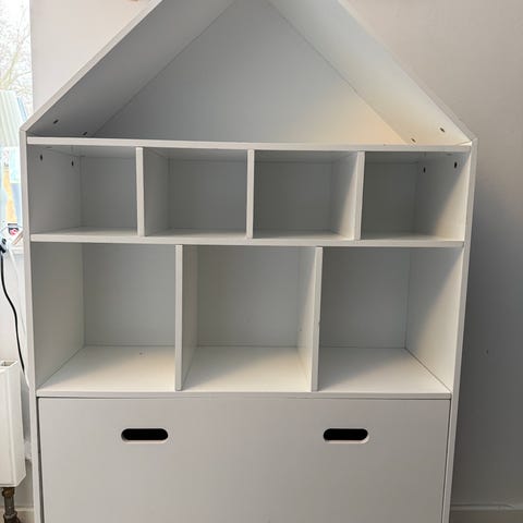 Jollyroom børnemøbel reol med skuffe i hvid og rosa. Reolen har flere hylder til opbevaring og en skuffe nederst. Designet med husformet top og velegnet til børneværelse.