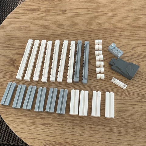 LEGO Architecture byggeklodser i forskellige nuancer af beige og grå. Klodserne har en murstensstruktur og kan anvendes til modellering og bygning af arkitektoniske modeller.