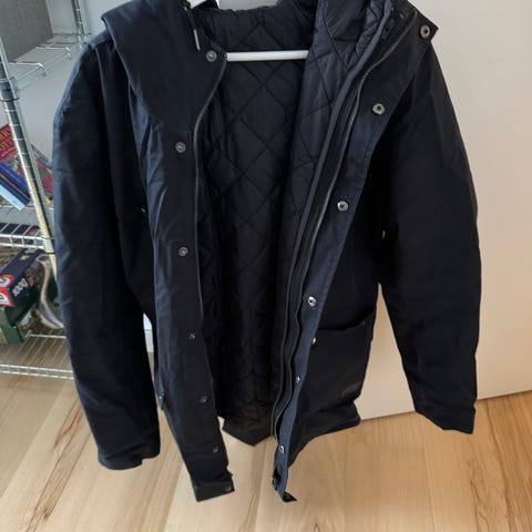Samsøe Samsøe Vinterjakke i blå farve, størrelse M. Jakken er lavet af bomuld og har quiltet for. Den har hætte og lukkes med lynlås og knapper. Designet til mænd og egnet til udendørs brug i vinterperioden.
