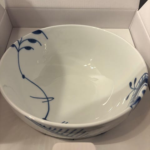 Helt ny Royal Copenhagen Blue Fluted Mega skål med en diameter på 21 cm. Skålen er håndmalet og fremstillet i porcelæn. Designet er klassisk med blå blomster og blade på hvid baggrund.