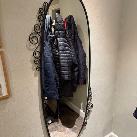 Spejl med brun læder strop. Jeg ved ikke hvad mærke det er. Fremstår helt nyt.