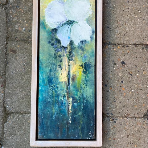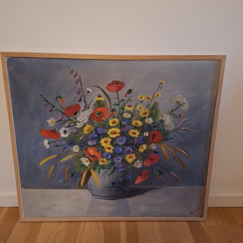 Annette Walther Fassing Flower Power maleri fra 2011. Maleriet viser en buket blomster i en vase med brug af forskellige farver og tekstur. Maleriet er indrammet og signeret af kunstneren på forsiden og bagsiden.