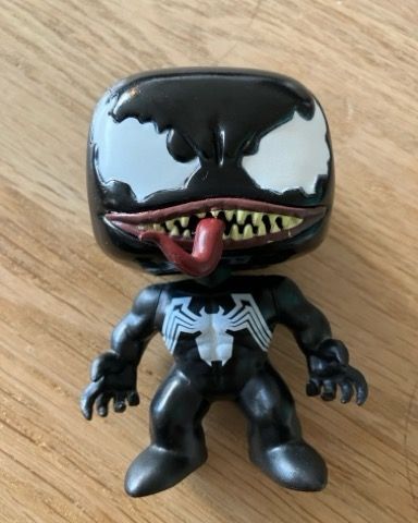 Funko Venomized Rocket figur med detaljeret design inspireret af Venom. Figuren har en karakteristisk sort og lilla farvepalette med hvide øjne og tænder, fremstillet i holdbart materiale.