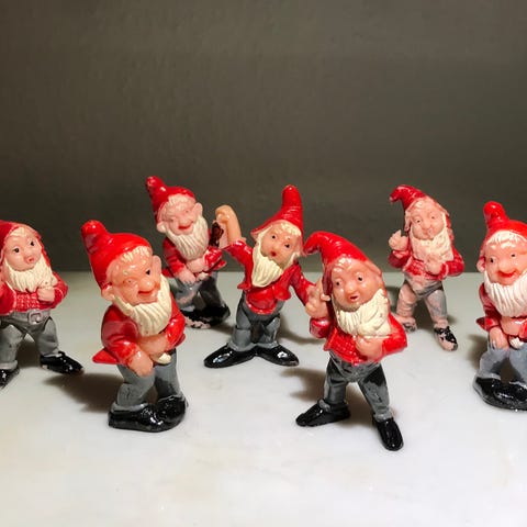 De er lavet i plastic, malet og ca. 8 cm. høje, med lidt afskalninger efter et langt ‘nisseliv’.