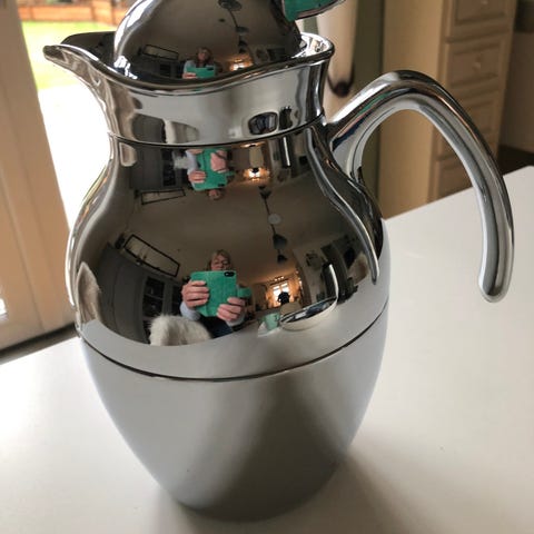 Alfi termokande med låg, udført i rustfrit stål med isolerende egenskaber. Kanden har en kapacitet på 1,0 liter og er designet til at holde drikkevarer varme eller kolde i længere tid.