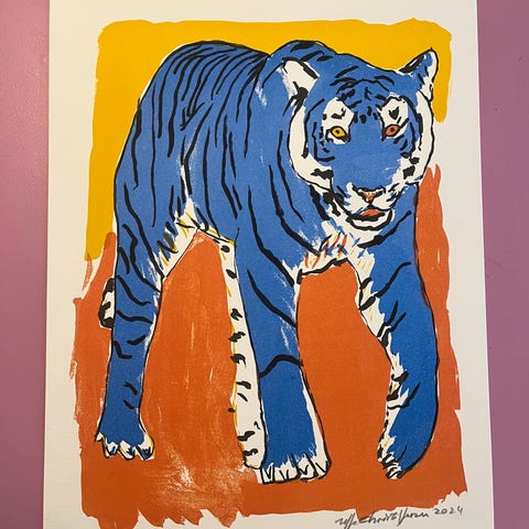 Uffe Christoffersen - Tiger litografi fra 2020. Serienummer 116/230. Farverig gengivelse af en tiger med detaljer i blå, røde og sorte nuancer på orange baggrund. Signeret og nummereret af kunstneren.