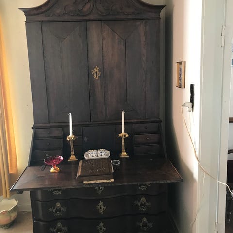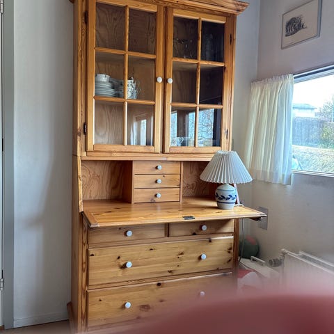 Fin chartol i mørk eg. Kan leveres. Kan bruges bare til opbevaring, men også som computerbord.