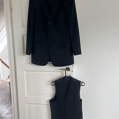 Smukt jakkesæt. Brugt 1 gang. Med jakke, bukser, vest, slips og lommetørklæde.. Bukser størrelse 88, vest og jakke størrelse 52..