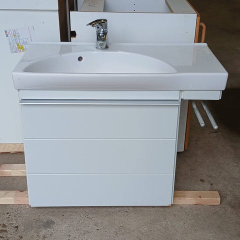 Badeværelses skab, håndvask, armatur, højskab og spejl.