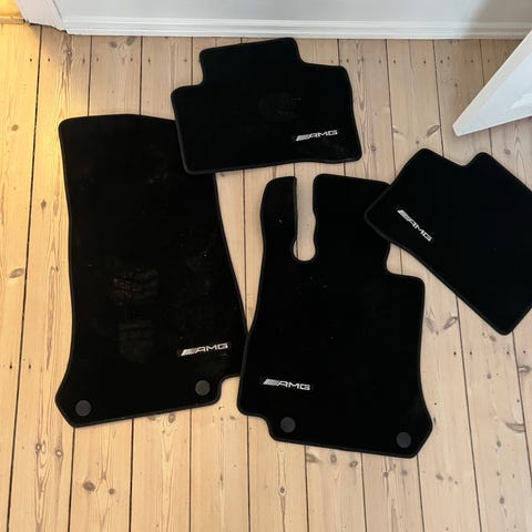 Mercedes-Benz bilgulvtæpper sæt i sort farve. Sættet inkluderer gulvtæpper til for- og bagsæder med monteringsbeslag for sikker fastgørelse. Materialet er tekstil, designet til brug i bilens interiør.
