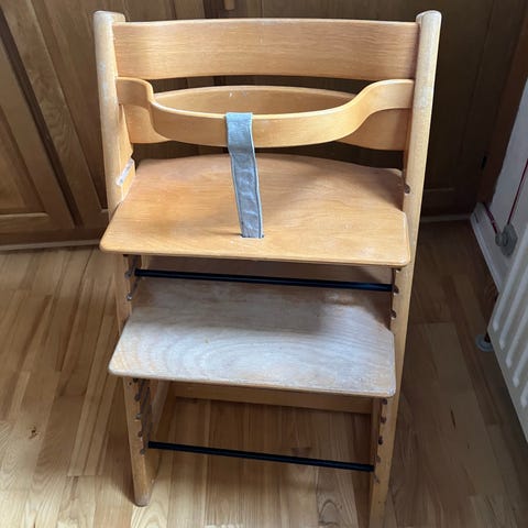 Trip trap højstol i træ med justerbare trinplader og sikkerhedssele. Designet til børn og kan tilpasses i højden for at følge barnets vækst.