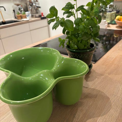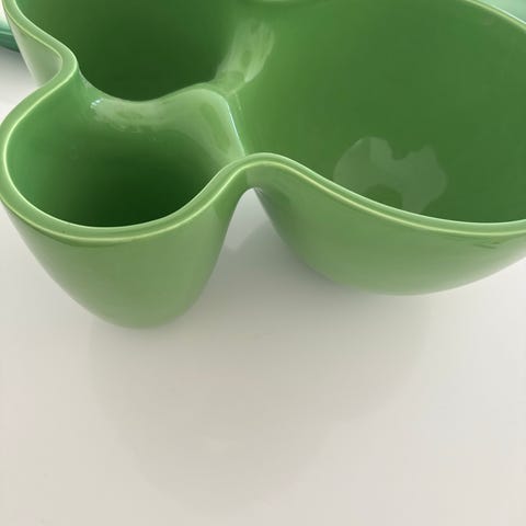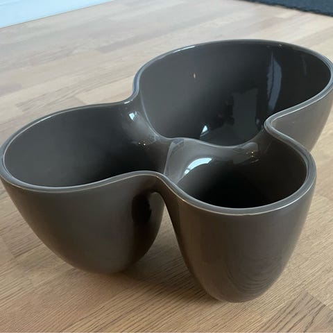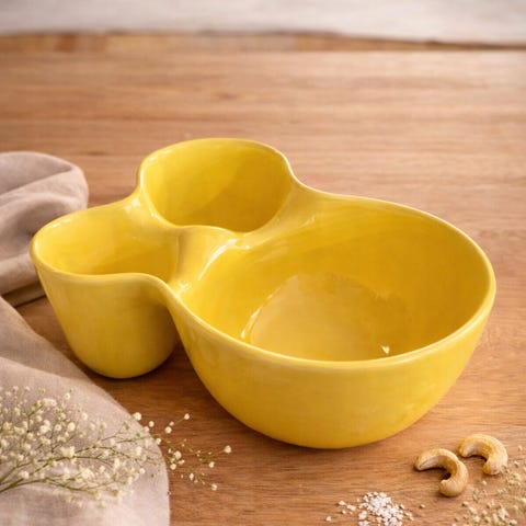 Den store Muuto designer skål af Ole Jensen i farven gul . Skålen har en unik form med flere rum, hvilket gør den velegnet til opbevaring eller servering af forskellige typer mad eller snacks.