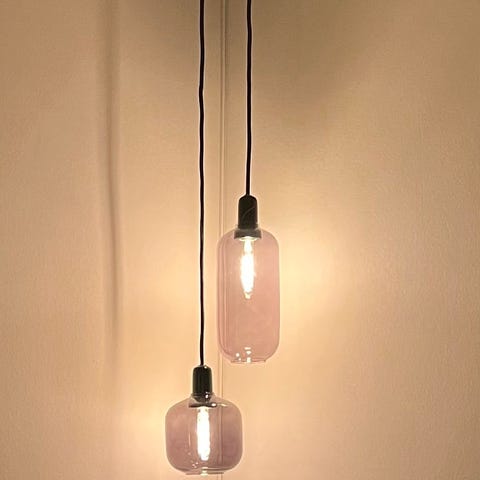 Fin klynge af tre lamper. Sat i roset i tre højder. Fin hyggebelysning til stuen.