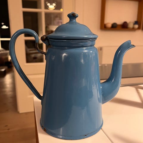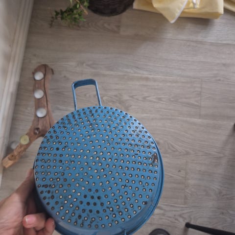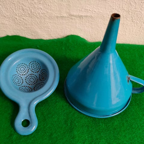 madam blå si med to hank godt stand sælges til samler, str. H. 8 x 20½ cm. i diameter kan hentes for 25 kr.