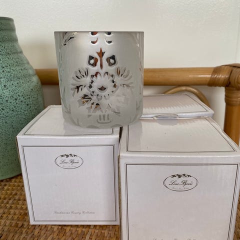 Lene Bjerre fyrfadslysestager med sølvkant og blomster motiv.