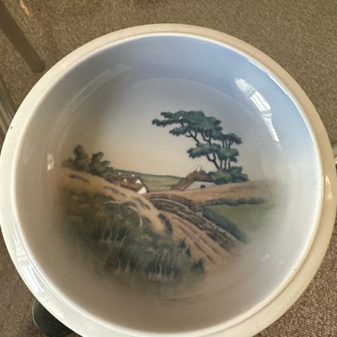 Bing & Grøndahl skål med gulddetaljer. Skålen har en rund form med dekorative elementer og en fod. Materialet er porcelæn med guldbemaling. Velegnet til brug som dekoration eller til servering.