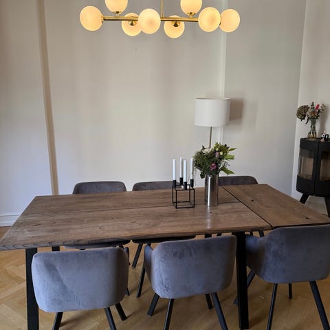 4 flotte spisebordsstole i grå velour sælges. Købt i ILVA og kun brugt 2–3 gange. De er nemme at rengøre, meget behagelige at sidde i og sælges udelukkende, da de desværre ikke passer ind i mit køkken.