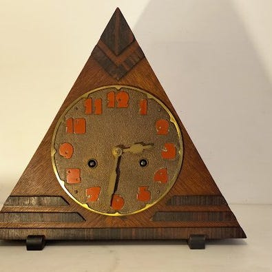 En smuk, velfungerende egefransk båd med en håndmalet urskive. Uret ser godt ud. På halve og hele timer høres klokken ved et slag på en klokke.