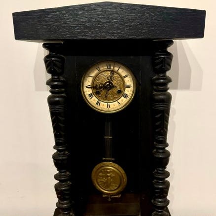 Formet sort træbase dekoreret med gyldne bronzeapplikationer og festoner, hviler på fire cirkulære ben. En cirkelrund hvid emaljedial med romerske tal for timer og arabiske tal for minutter. Signeret P r Le Roy, a Paris.