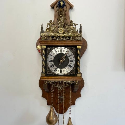 En art deco-ur lavet af marmor. Til venstre en skulptur med en liggende hjort. Stor tydelig urskive med tal. Uret vejer 6 kg. Sendes godt pakket.