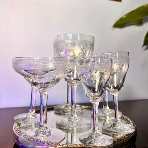 Dekantøren er smukt dekoreret med indgraverede blomsterornamenter og forgrenede løvgrene, hvilket giver den en let og yndefuld karakter. Sådanne små dekantører blev produceret i forskellige nuancer, herunder klar, grøn, gul og lilla krystal, og blev højt værdsat for deres dekorative og funktionelle appel.