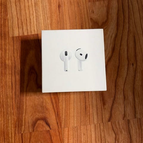 Apple AirPods 4 headset. Trådløse øretelefoner med opladningsetui. Designet til brug med Apple-enheder, kompatible med Bluetooth. Hvid farve.